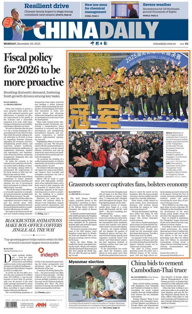 中国日报12月29日头版截图。12月27日晚,2025湖南足球联赛(简称“湘超”)在长沙贺龙体育场举行了一场激动人心的决赛。这场比赛总共吸引了43,695名观众。在激烈的角逐中,永州队以1-0击败常德队夺得冠军,为这项全民参与带动的草根体育和文化旅游消费盛会画上了圆满的句号。决赛的制胜时刻出现在第58分钟。 24岁的永州队中后卫谷文杰打破僵局,攻入关键一球,为球队锁定胜局。 12月27日,在长沙举行的“湘超联赛”颁奖典礼上,永州队球员庆祝夺冠。郭立良摄,44岁球迷陈宇峰回忆起观看比赛的场景,比赛时的热闹气氛仍历历在目。他萨id:“每个人都热情地为自己的球队加油,就像在世界杯上一样。进球后的欢呼声震耳欲聋。”由于他支持的长沙队没有进入决赛,他决定支持永州队。 “整场比赛我见证了永州队的斗志,他们克服了重重困难,继续战斗。”永州队的夺冠之路是从一座被当地人称为“野体育场”的市体育场开始的。那里的院子很破旧,有几十年的历史了。 “湘超联赛”开赛前,永州市用了近两个月的时间“快修”球场,使其达到承办比赛的标准。但首场比赛仍然在一些时间进行,面临着翻修尚未完全完成的困难局面。不过,有限的设施并没有浇灭永州球员和球迷的热情。面对座位严重不足,永州创新推出“吊挂”体育场周围设置了“门票”和“砖票”。在保证安全的前提下,允许球迷爬树或站在砖砌的临时看台上观看比赛。12月27日,永州球迷在永州体育场通过直播观看了“湘超”决赛。郭雷 摄 两周前的四分之一决赛,正值永州队客场作战,3万多名球迷挤满了永州体育场,通过大屏幕现场观看比赛。球队获胜后,球迷们前往蓝三岸庆祝,这些照片在社交媒体上广为流传,引起了国内外网友的关注,称这种支持是“每支球队都梦想的”。19岁的永州队前锋高翔在颁奖典礼上获得了最佳运动员的称号,他感慨道:“我们有最好的球迷!”id他的队友一开始并不认为他们会赢得冠军。 “一切都像一场梦。”湖南省体育局“湘超”组委会相关负责人表示,朝气蓬勃的年轻球员的广泛参与,为“湘超”联赛注入了最强劲的能量。年轻人在球场上奋力奔跑的景象是本届赛事的一大特色。整个比赛的学生队队员总数达到262人,占全部参赛队员的近40%。前15轮比赛中,大学生和中学生共打进132球,占全部进球数的50%以上。 “我们很高兴看到这些青少年在大舞台上发光发热,我们将以此为基础,推动全省青少年足球运动的发展。”自2025年9月开赛以来,“湘超”的影响力已超越湖南省足球协会。足球场馆已成为拉动文化和旅游消费的重要引擎。官方数据显示,《湘超》现场累计观看人数已突破200万人次。比赛期间,主城接待各旅游区消费名额超过6000万人次,现场观看《湘超联赛》的总人数超过6000万人次。突破121亿元。 (中国日报记者何春李木春编译朱友芳熊梦婷)